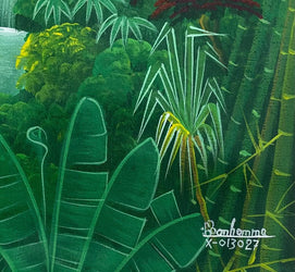 Self-taught artist Albott Bonhomme was born in 1963 in Port-de-Paix, Haiti. He became a professional artist in 1990 and painted birds in a lush oasis. He has been exhibited worldwide, and his art is appreciated by many collectors internationally, mainly in the US and Japan. His "Tropical forest scenes evoke the environmental problems confronting Haiti" (Peintres Haitiens by Gerald Alexis, Editions Cercle d'Art, 2000)