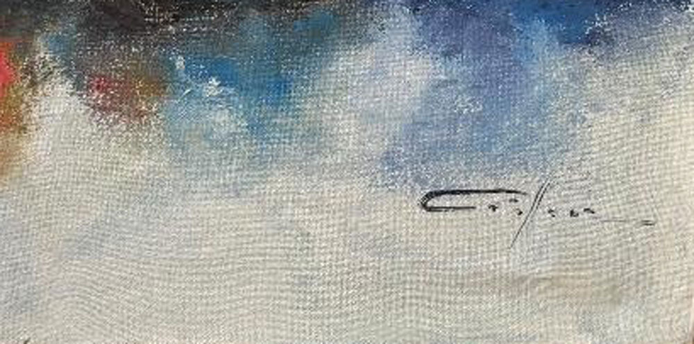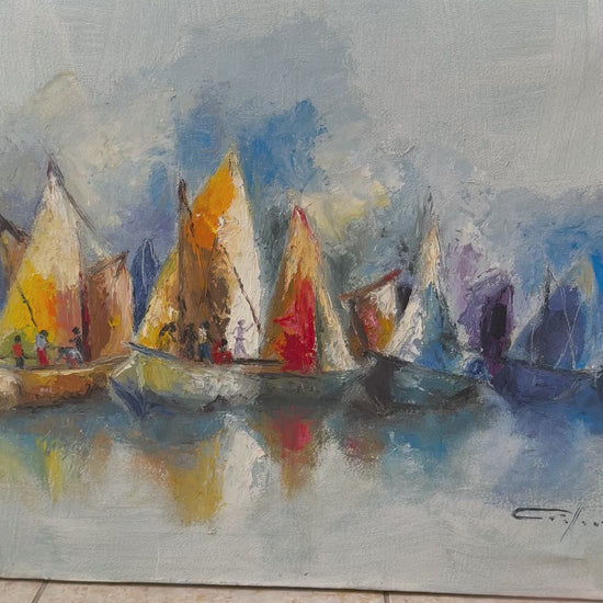This expressive harbor scene by Haitian artist Dieudonné Cédor depicts sailboats gathered on calm coastal waters, with small figures visible aboard the vessels. The composition captures a quiet moment of maritime life, emphasizing both human presence and the surrounding atmosphere. Cédor renders the scene with loose, gestural brushwork and a luminous palette. Warm tones of yellow, orange, and red in the sails contrast with soft blues and violets in the water and sky, creating a balanced interplay of color and light. Reflections ripple across the surface, reinforcing the sense of movement and depth. Dieudonné Cédor was a Haitian painter and founding member of the Centre d’Art in Port-au-Prince, known for expressive interpretations of Haitian life and landscape. His work often combines structural composition with painterly fluidity, capturing both environment and mood. This original oil painting is hand-signed by the artist and is accompanied by a Certificate of Authenticity issued by Myriam Nader Haitian Art Gallery. The work comes from a private collection in New York and will be shipped directly from the collector with professional packaging.