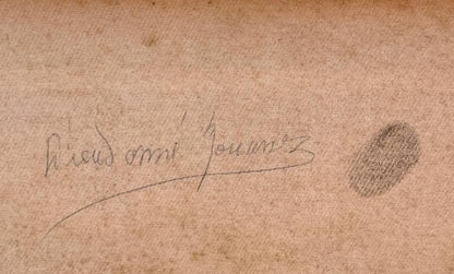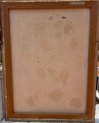 This intricate oil painting by Dieudonné Rouanez depicts a lively Haitian marketplace bustling with figures, produce, and woven baskets arranged in rhythmic layers of color and activity. The artist’s distinctive style shines through in the highly detailed clothing, expressive faces, and carefully organized market goods that fill the composition from edge to edge. Rouanez frames the scene with dramatic red curtains and a textured stone-pattern border, transforming the daily life of Haitian vendors into a theatrical tableau rich with cultural symbolism and visual energy. This vibrant work reflects Rouanez’s celebrated ability to portray community, movement, and tradition in a uniquely decorative manner. The painting includes full provenance and a Certificate of Authenticity from Myriam Nader Haitian Art Gallery.