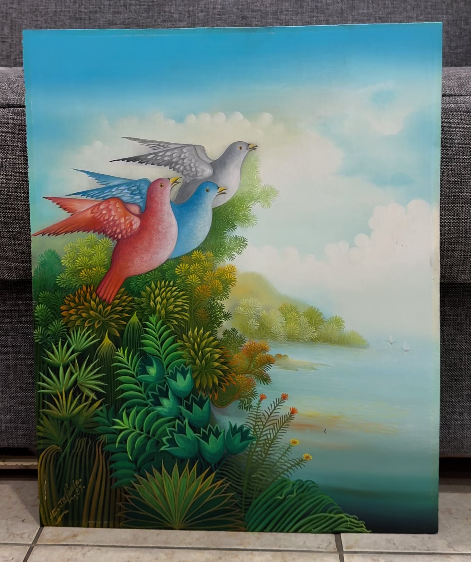 The late renowned Haitian artist Eric Jn-Louis painted this peaceful scene of three colorful birds in 1989 on oil on board. This painting is in good condition, sold unframed, and signed in the lower left corner. This artwork belongs to the private collection of Myriam F. Nader.