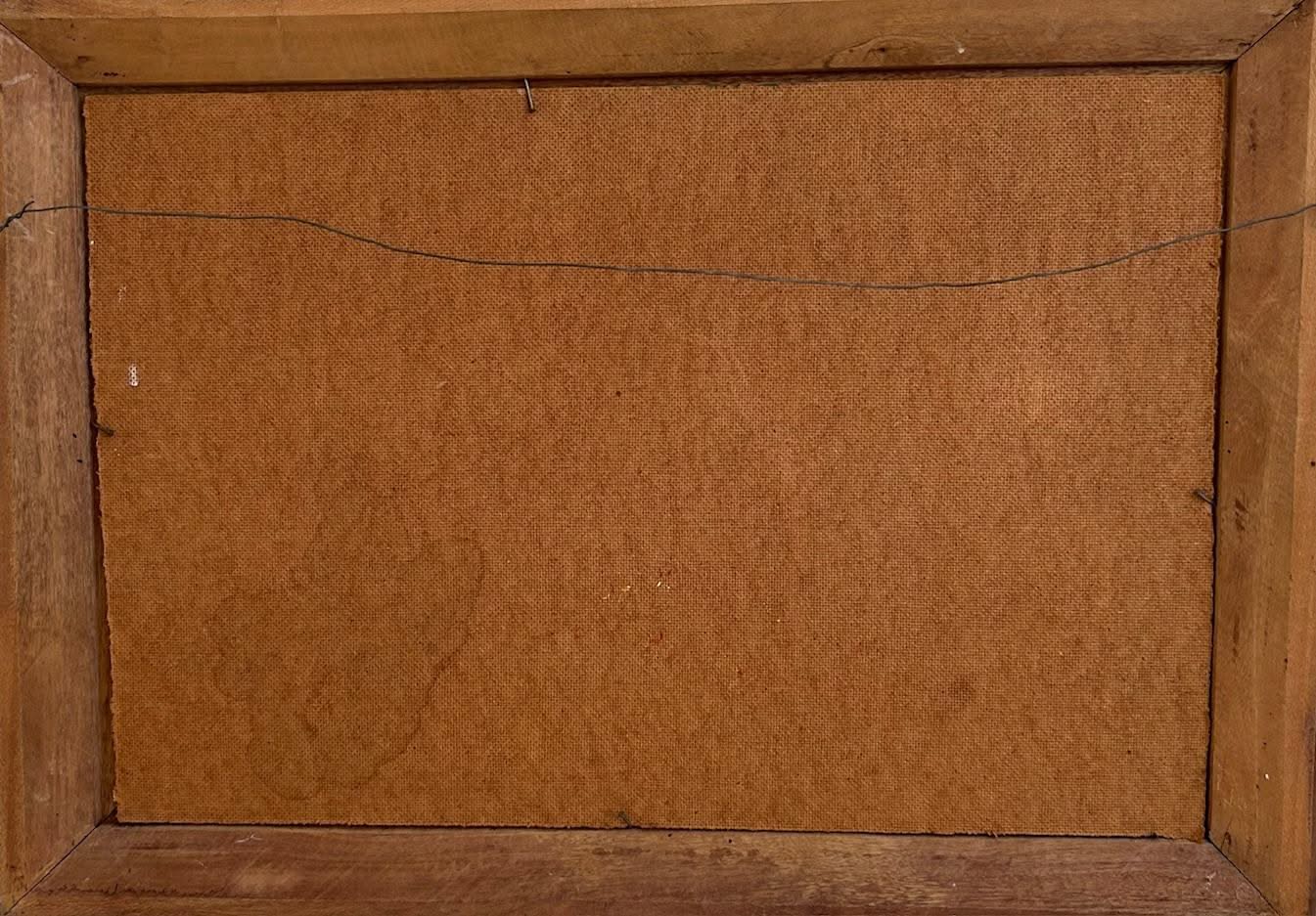 This richly detailed oil on board painting by Gesner Abelard presents a vibrant depiction of Adam and Eve in a lush, Eden-like paradise filled with dense tropical foliage and exotic wildlife. Abelard’s imaginative rendering combines symbolic Biblical narrative with the distinctive palette and stylized forms of Haitian art. Giraffes, zebras, tropical birds, flowering plants, and layered palm fronds frame the serene central figures, creating a dreamlike environment that blends innocence, beauty, and cultural reinterpretation. The warm gradient sky and intricately textured vegetation reveal the artist’s mastery of color harmony and decorative composition. This work comes from a private collector in New York and will be shipped directly from the collector. A Certificate of Authenticity will be issued by Myriam Nader Haitian Art Gallery upon purchase.