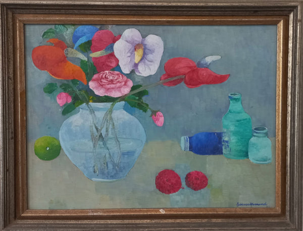 Gesner Armand painted this vintage 12"16" Vase of Flowers in the 1960s Oil on Board Framed Painting of a vase of flowers and glasses. This piece belongs to a private collector in Florida and is sold framed and in good condition. It is signed and dated in the lower right corner. The date is under the frame.