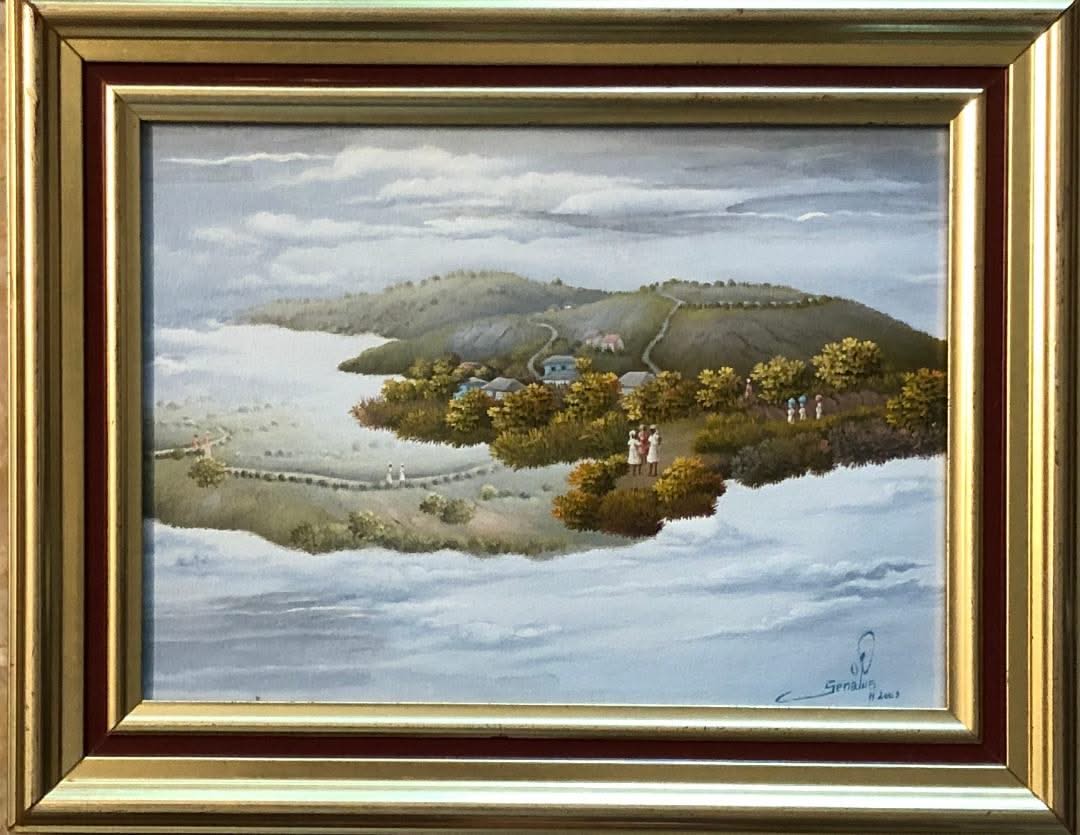 Jean-Louis Sénatus’s Dreamy Landscape (2009) is a luminous, collector-ready oil on canvas that transforms the Haitian countryside into a serene, atmospheric vision. Soft gradients of sky and land, layered foliage, and gently simplified forms create a peaceful sense of depth—an inviting work that brings warmth and calm to any interior. Sénatus’s confident color harmonies and refined brushwork make this painting an ideal acquisition for both new and seasoned collectors seeking a strong example of contemporary Haitian landscape painting. This artwork belongs to the private collection of Georges S. Nader and is offered for sale as-is in good condition. Presented by Myriam Nader Haitian Art Gallery, the work includes provenance and a Certificate of Authenticity issued upon purchase.