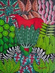 BUY NOW this primitive painting signed by the Haitian artist Raymond Lafaille. This painting represents a jungle scene. It is an original oil on canvas and dated 1980.