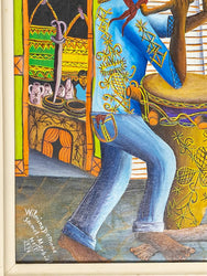 A colorful voodoo ceremony with a rooster by Wilmino Domond, the late famous Haitian master painter from Jacmel, in a naive style. It is signed & dated: "Wilmino Domond Jacmel Marbial Haiti 1946." in the frontal left lower corner. It is in good condition, framed, and safely shipped by the private collector owner from Caracas, Venezuela. Our gallery will provide a certificate of authenticity upon purchase.