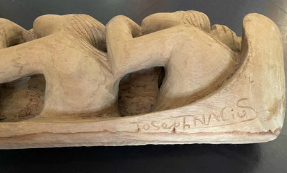 Fine Haitian sculptor Nacius Joseph was born in Petit-Goâve, Haiti, in 1939. He lived and worked in Port-au-Prince for several years, guided and advised by the sculptor Gilbert Duperrier. According to some observers, Joseph’s art at first lacked originality and imagination. He could define his style and become a fine wood sculptor only after returning to his native town. Profoundly involved in voodoo, Joseph was then the only Haitian artist working in wood who drew his subject matter from his belief system, marking his art with great authenticity and strength of conviction. His complicated, elegant structures embody the poetic aspect of his religion rather than its austere spiritual grandeur. He works both in the round and embossed. (Source: Haitian Art by Ute Stebich, Abraham Editions for the Brooklyn Museum).