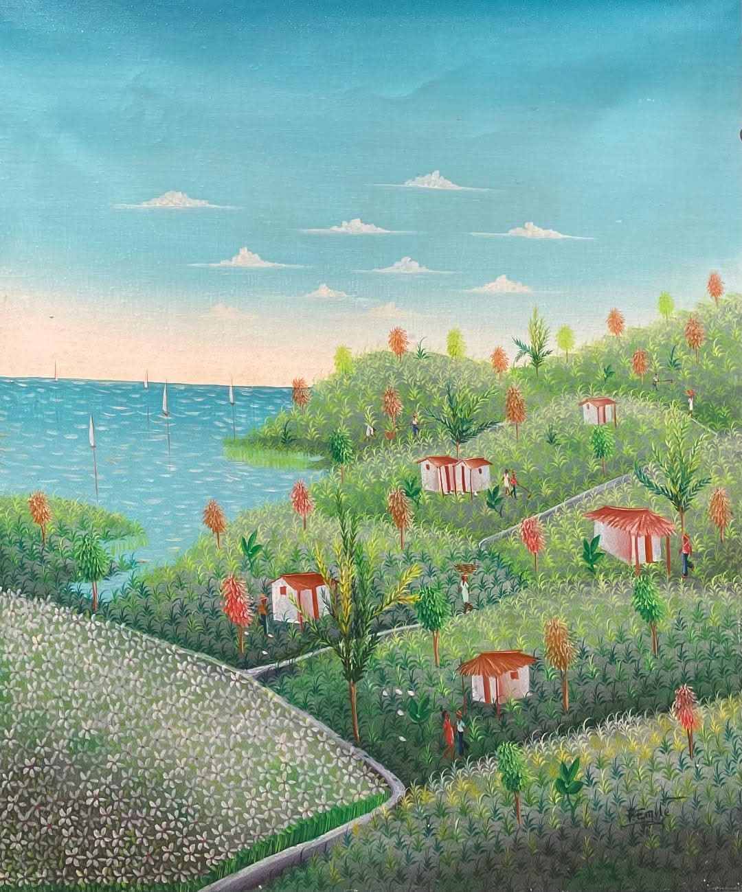 BUY NOW this primitive painting signed by the Haitian artist Fritz Emile. This painting depicts a landscape in Haiti. It is an original oil on canvas and it is dated circa 1980.