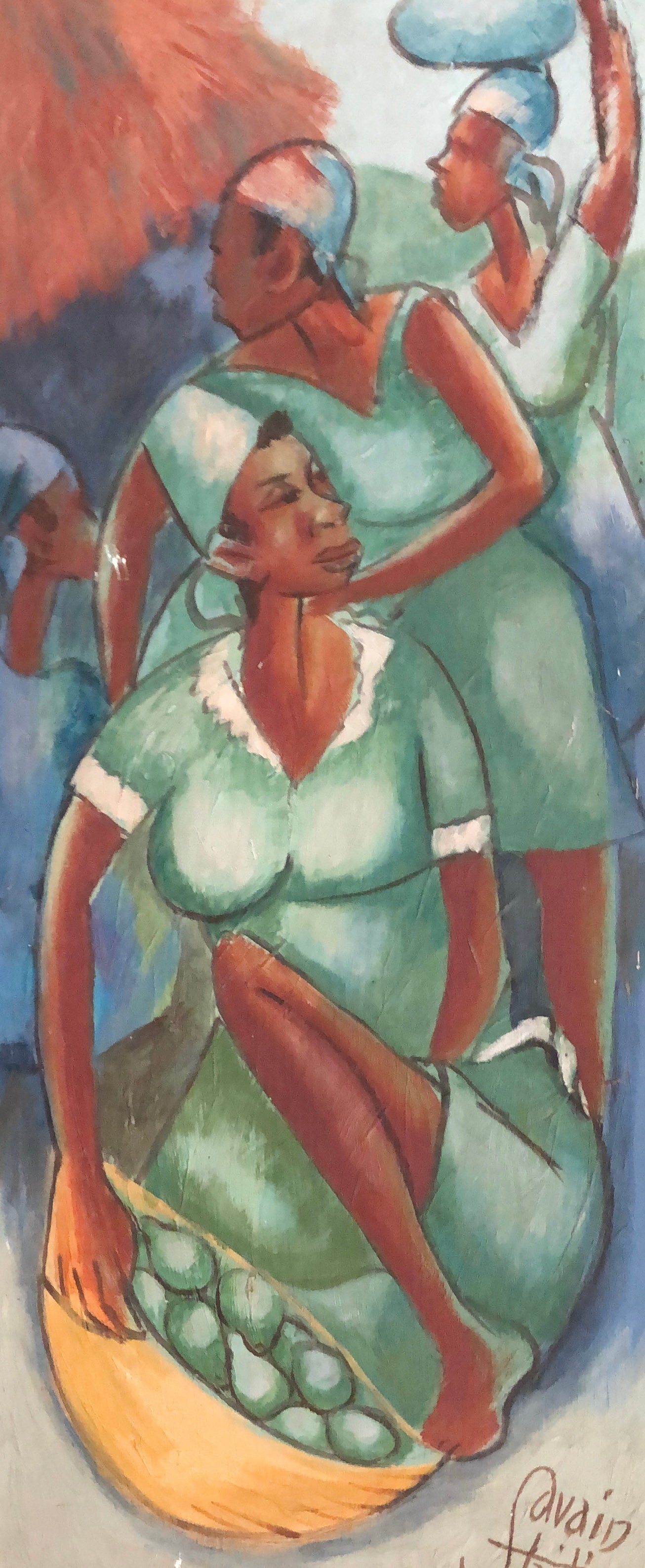 Women at the Market is an elegant oil-on-board painting by renowned Haitian artist Pétion Savain. It portrays a group of women in rhythmic motion, their forms gracefully intertwined as they carry and sort baskets of fruit. Painted with a refined palette of greens, ochres, and blues, the composition exudes both structure and warmth. Savain’s sculptural figures and fluid lines reveal his mastery of form and his poetic interpretation of Haitian life.