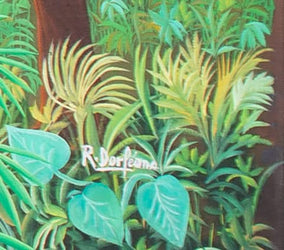 Well-known Haitian painter Raymond Dorleans was born in Haiti in 1947 and died in Martinique in 2000. His first art exhibit was in 1973, and dark blue-green landscapes with bright figures characterize his paintings. His art is in many private collections worldwide, cited in many Haitian art books, sold at Sotheby's, and shown at Musee des Beaux-Arts d'Orleans in France. "A landscape artist, Dorleans is a master of airy perspectives," says Gerald Alexis in his book Peintres Haitiens.